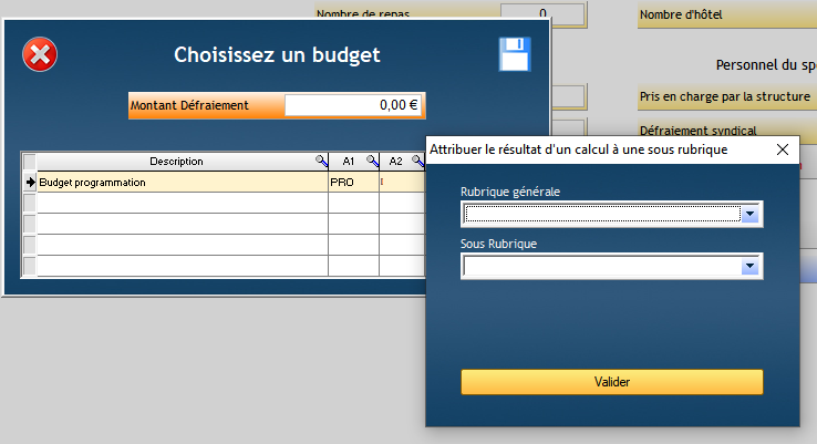 2/ sélectionnez le nom du budget, la rubrique et la sous-rubrique puis validez