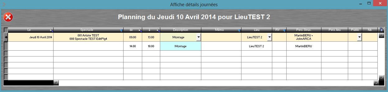 Il suffit de sélectionner un élément dans la table des lieux et de double-cliquer. Une fenêtre s'ouvre et affiche les lignes de planning de la journée.