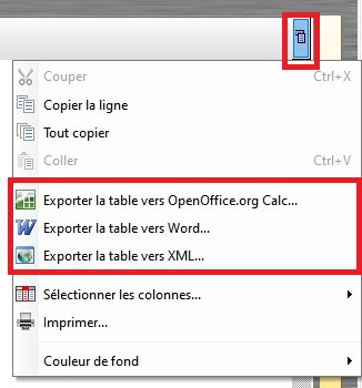 Vous pouvez exporter les données de toutes les tables de RS vers Word, Excel ou XML par un clic gauche (ou droit) sur le Menu options en haut à droite de la table.