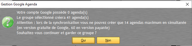 Info : la version gratuite du Google Agenda permet une synchronisation maximale de 14 agendas. Pour fonctionner, votre groupe doit donc contenir 14 éléments maximum. Au-delà, l’export sera incomplet et un avertissement s’affichera (la version payante de Google accorde actuellement 60 agendas).
