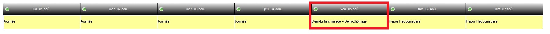 Dans cet exemple la nouvelle description cadre a été créé : elle compte une demi-journée de chômage partiel et une demi-journée enfant malade (soit deux demi-journée), son libellé est DEM-DCHOM.