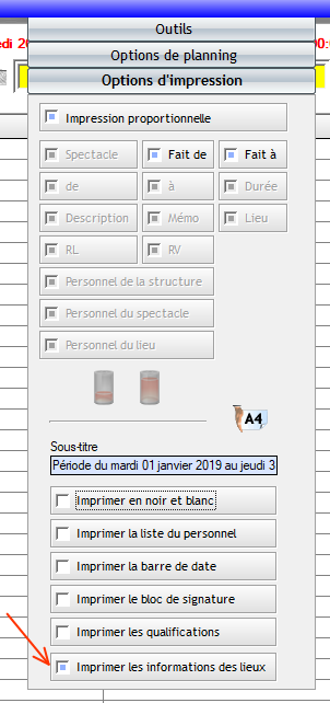 1/ Allez dans la boîte à outils de l'onglet Planning, dans le volet "Options d'impression"