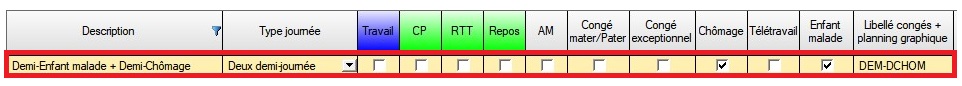 Dans cet exemple la nouvelle description cadre a été créé : elle compte une demi-journée de chômage partiel et une demi-journée enfant malade (soit deux demi-journée), son libellé est DEM-DCHOM.