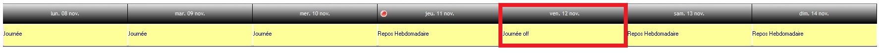 Dans cet exemple la nouvelle description cadre a été créé : elle compte comme une journée entière (1 case cochée) de repos (pas de temps de travail), son libellé est JOFF.