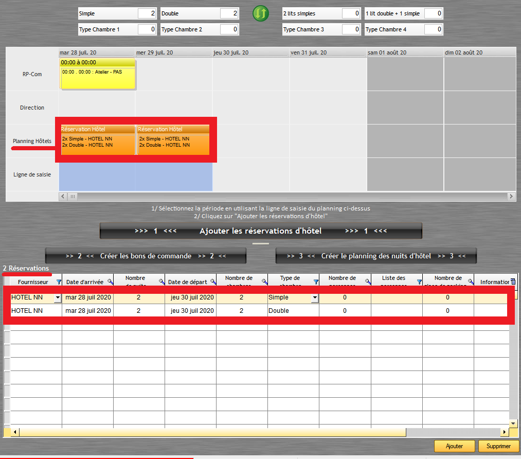 Si les réservations portent sur plusieurs hôtels, le logiciel créé un bon de commande par hôtel.