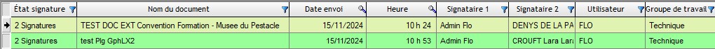 Le destinataire peut alors signer le document. Quand le responsable structure ET le destinataire du document ont tous les deux signé, la ligne désignant le document apparaît en vert dans la table des documents en haut. La colonne "État Signature" porte alors la mention "2 Signatures".