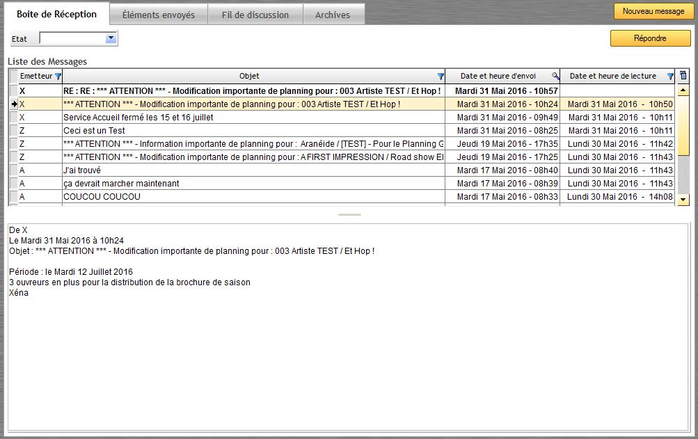 La Messagerie interne est composée d'un Bouton "Nouveau message" et de 4 onglets :