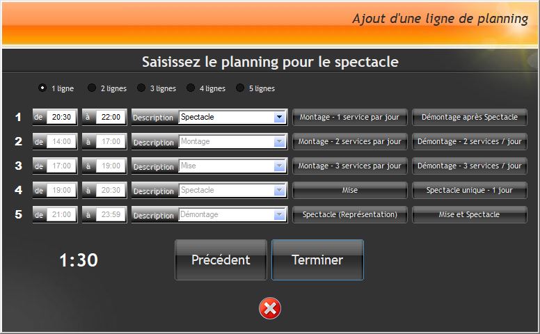 Info : Le niveau de priorité permet de déterminer le code affiché. Si dans une même journée et un même lieu, il y a par exemple des montages, un spectacle et des démontages : seul le code de description S est visible, car la description Spectacle est prioritaire sur toutes les autres descriptions.