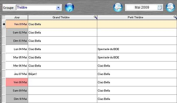 Rouge = La description "Spectacle" est saisie dans le planning (les représentations sont visibles).