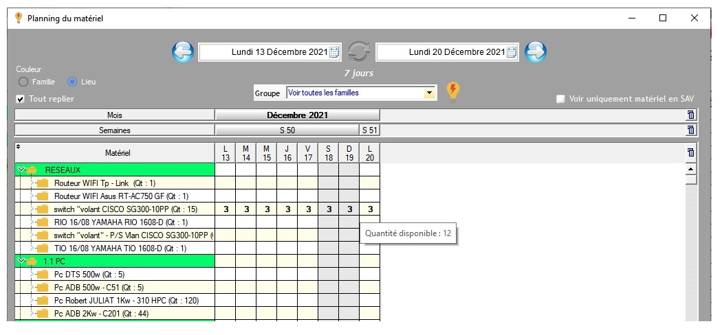 Le planning affiche jour par jour la quantité de matériel affectée sur des spectacles ou des activités dans une période sélectionnée.
