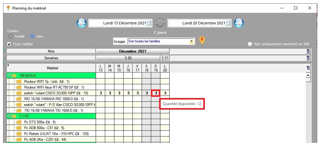 Connaître la quantité disponible d'un matériel (jour par jour) :