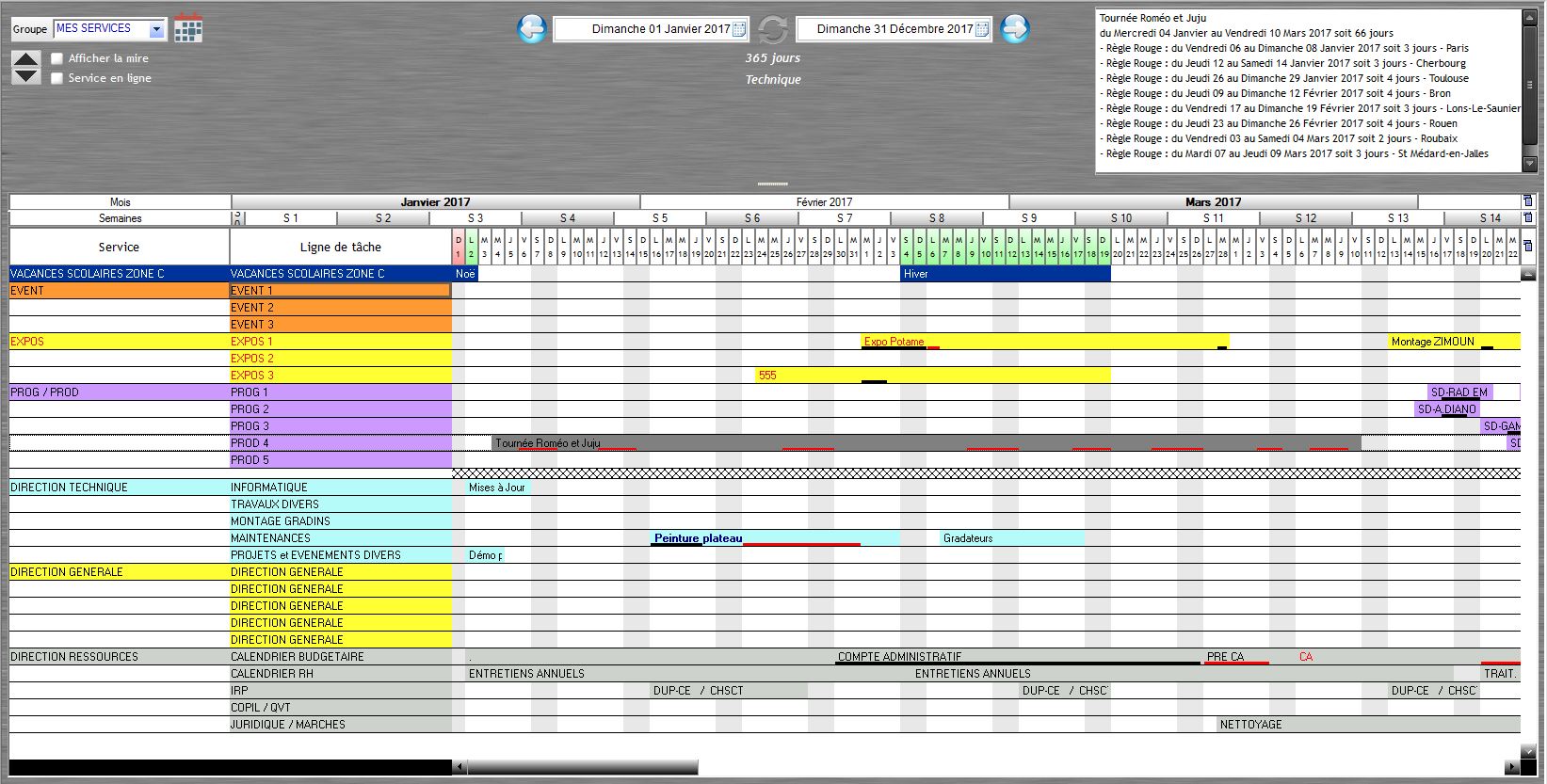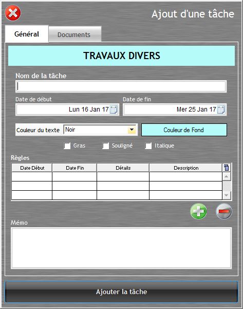 Des règles (rouge ou noire) peuvent être ajoutées à la tâche pour souligner des jours particuliers de la période. Elles se créent dans la fenêtre de création ou de modification de la tâche et sont visibles dans le planning.