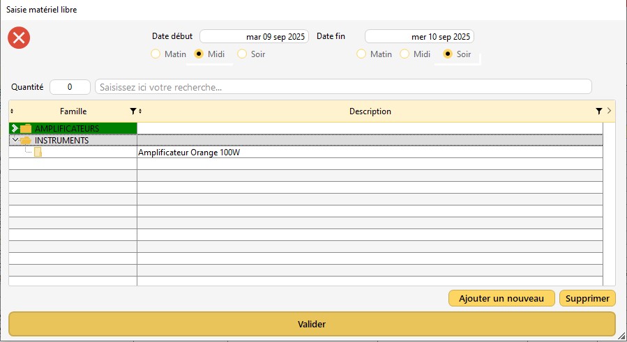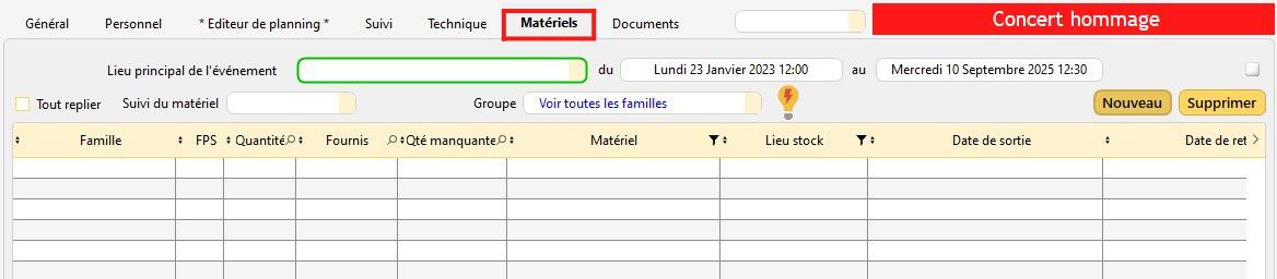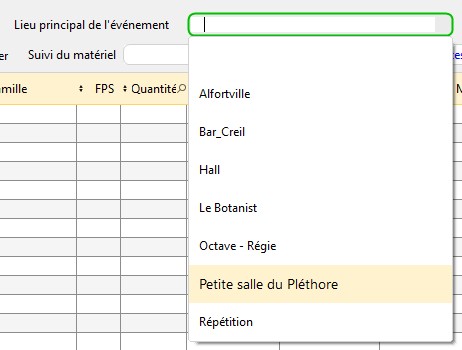 Info : Par défaut, la fenêtre Choix du Matériel affichera le stock du lieu principal de votre évènement.