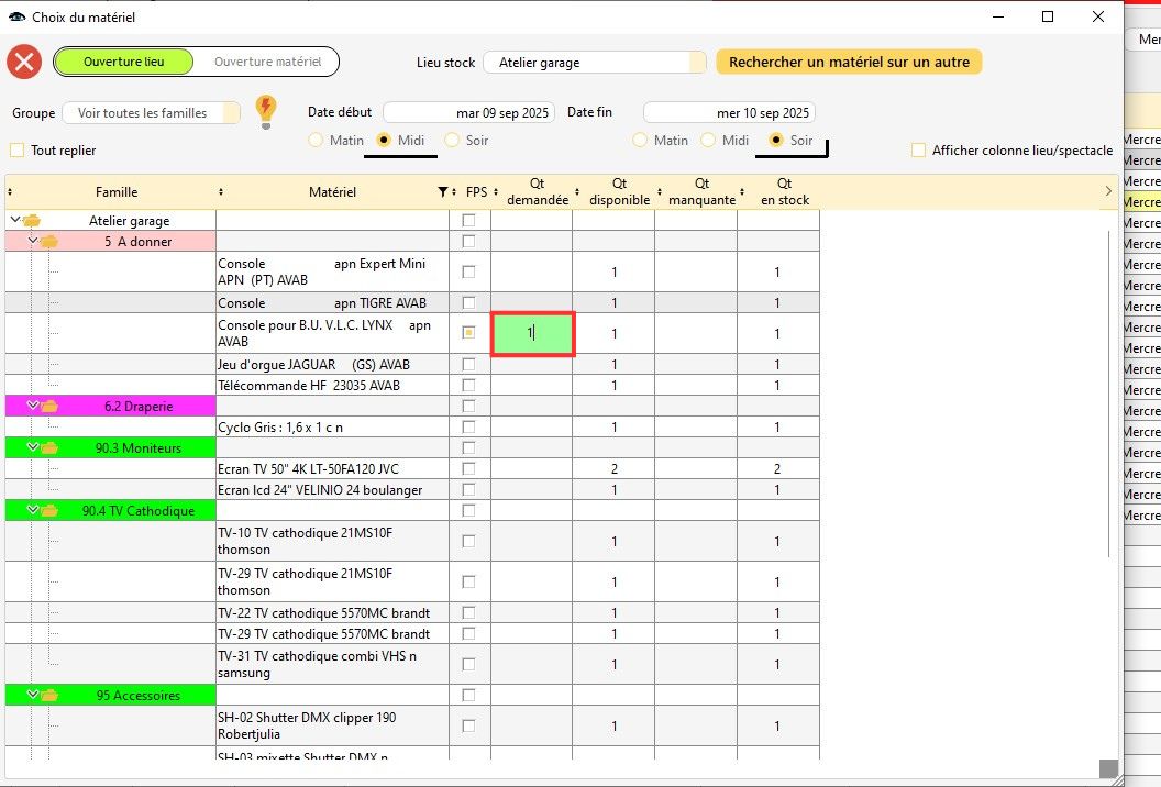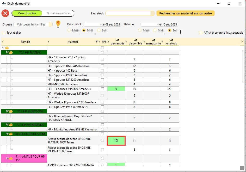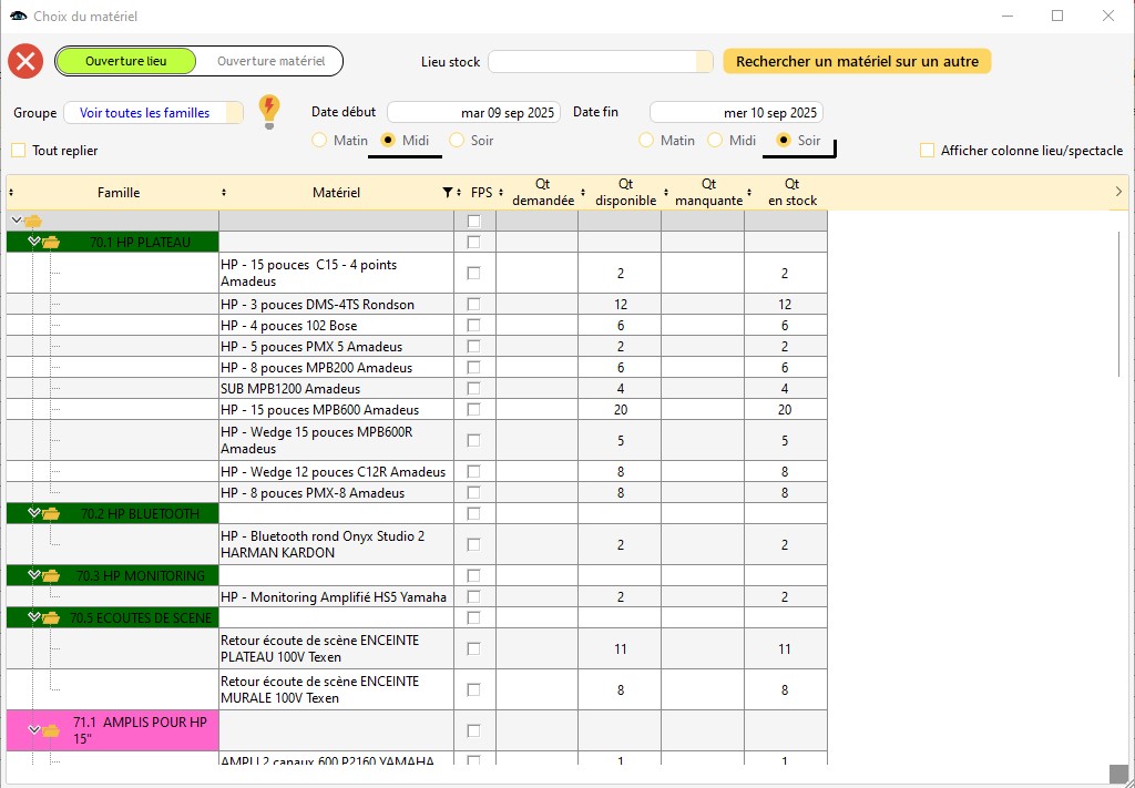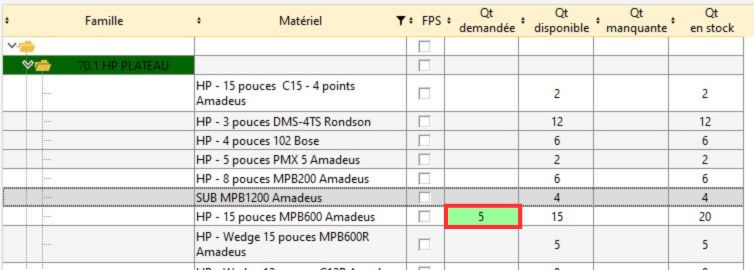2/ Sélectionnez le matériel voulu, indiquez la quantité à réserver et cochez la case "FPS" (Fourni Par le Spectacle).