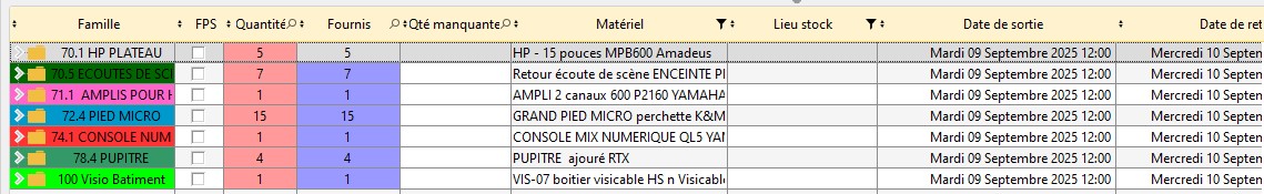 -"Quantité" : la quantité de matériel réservée pour le spectacle