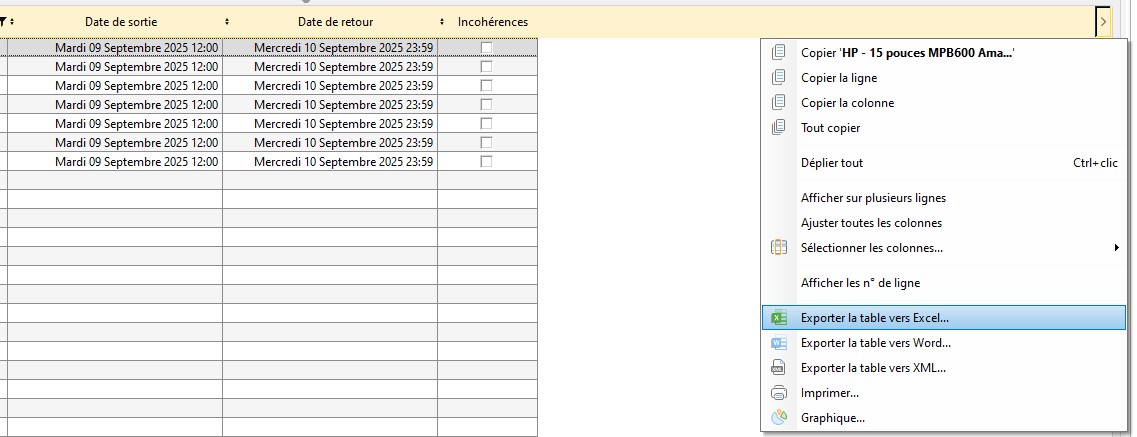 1/ Faites un clic droit sur une ligne du matériel et sélectionnez