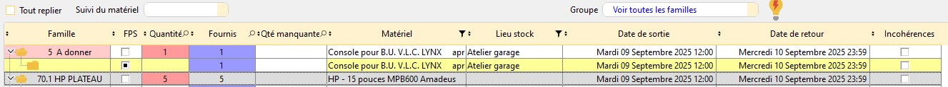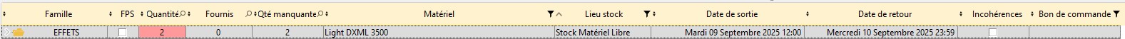 La ligne de matériel apparaît alors en jaune sur la table Matériel. Le stock général ne sera pas impacté par cette réservation.