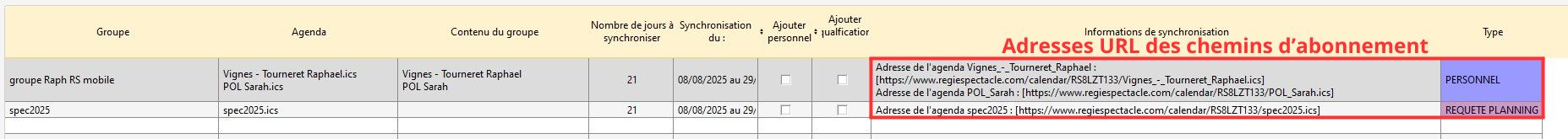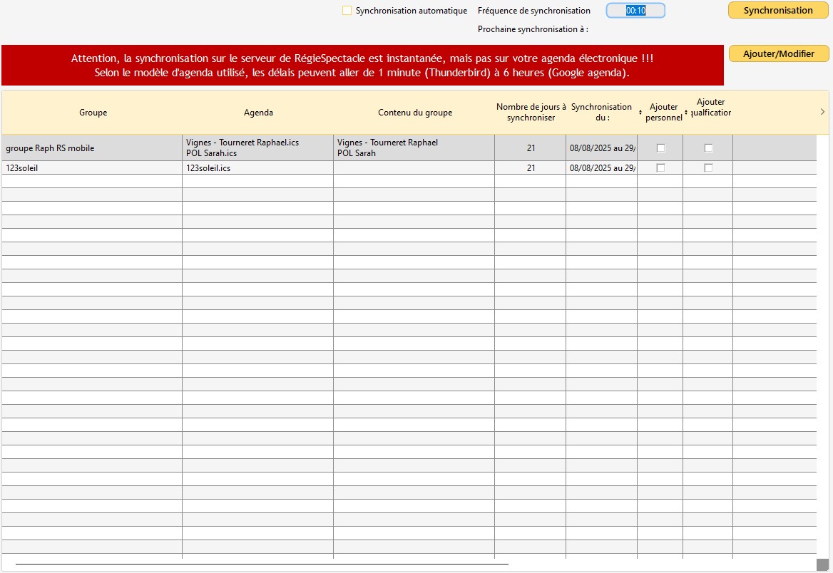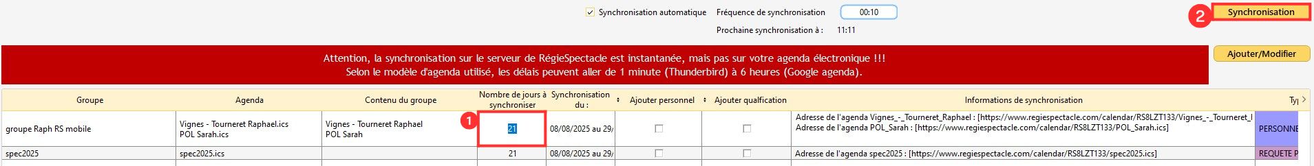Info : La synchronisation n'est pas en miroir, c'est-à-dire que la modification des agendas électroniques ne modifient pas les plannings de RégieSpectacle. La synchronisation ne se fait que dans un seul sens : de RégieSpectacle vers les agendas électroniques.
