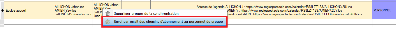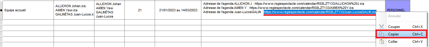 Les personnels planifiés sur les plannings du groupe de lieu ou de personnel recevront un e-mail avec les chemins d'abonnement. Charge à eux de les copier-coller dans leur propre agenda électronique.