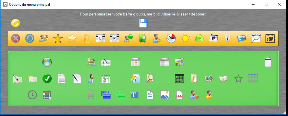 1/ Choisissez votre icône et faites-la glisser dans la barre jaune au-dessus (ou inversement pour la retirer).