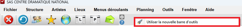 L'ancienne barre d'outils principale regroupe les outils les plus utilisés par l'utilisateur dans RégieSpectacle. Elle est toujours visible lors de la navigation et permet d'actualiser les tables, d'ouvrir ou fermer les différentes fenêtres et de passer d'une fenêtre à une autre. La barre d'outils s'adapte aux droits et restrictions de l'utilisateur.