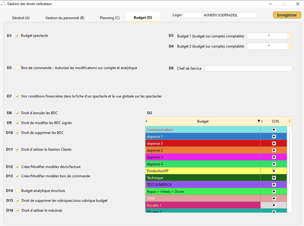 Dans la fenêtre de gestion des droits utilisateurs, dans la table "D2", sélectionnez les rubriques avec lesquelles l'utilisateur va devoir interagir, puis cliquez sur "Enregistrer".