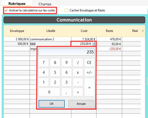 Info : s'il y a déjà un chiffre dans la case, la calculatrice le garde en mémoire pour faciliter le calcul pour l'utilisateur. Cela permet d'ajouter un nouveau montant sans avoir à supprimer l'ancien.