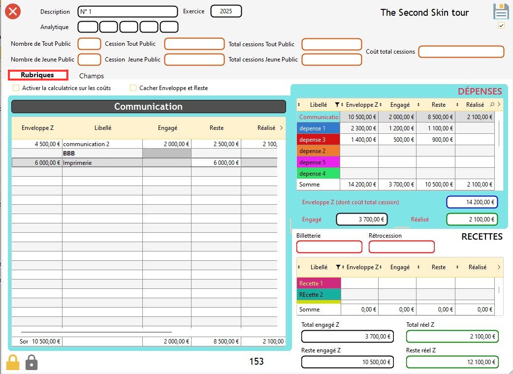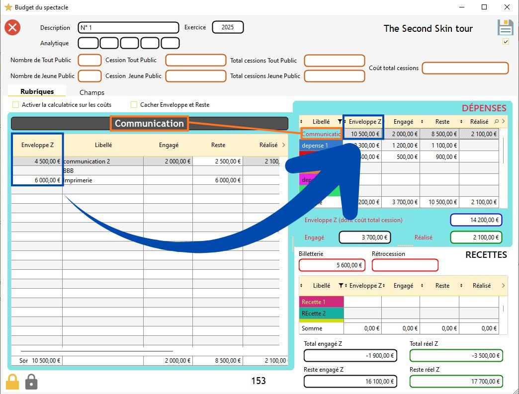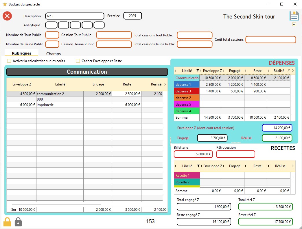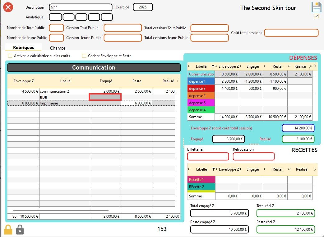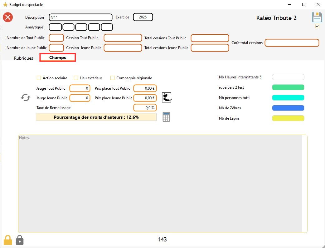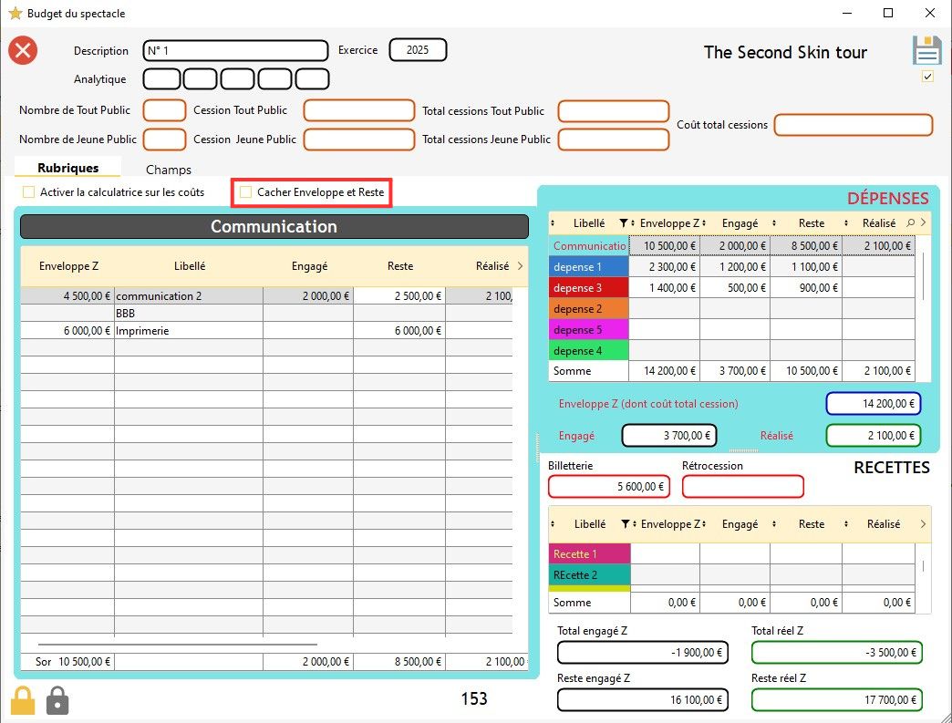 Info : dans le budget d'un spectacle, vous avez la possibilité de verrouiller une case sans qu'il y ait de valeur dans cette case (dans ce cas, la valeur est de zéro). Si vous verrouillez une case sans qu'il y ait une valeur indiquée dessus, elle se colorera en gris.
