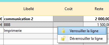 Chaque sous-rubrique peut être verrouillée indépendamment des autres.Toute la ligne sera verrouillée : l'enveloppe, le coût et le reste.