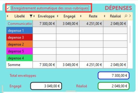 Info : Une coche présente au dessus de la table des dépenses vous permet d'enregistrer automatiquement les données que vous renseignez dans les sous-rubriques du budget dès que vous sélectionnez une autre rubrique générale en suivant. Ainsi, vous n'aurez plus le message d'enregistrement à chaque fois que vous changerez de rubrique générale.