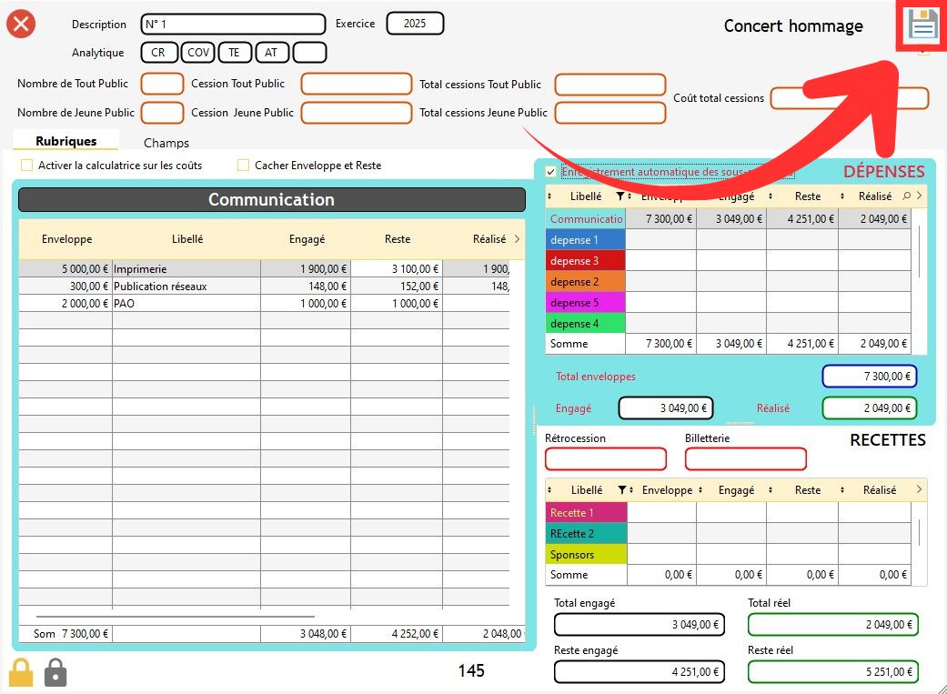 . Lorsque vous cliquez sur la disquette en haut à droite de la fenêtre du budget du spectacle.