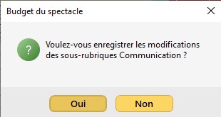 . Lorsque vous renseignez une donnée dans une cellule et que vous changez de rubrique générale dans le budget du spectacle, un message apparaît vous proposant d'enregistrer les données liées à la rubrique générale.