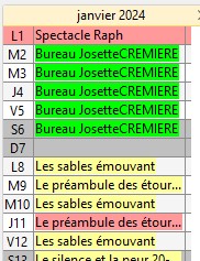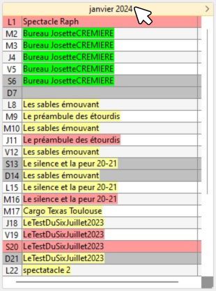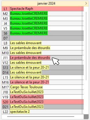 . Colonne 2 : Lignes de journée : ces lignes de journées sont composées de plusieurs noms de fiches spectacles ou activités quand plusieurs évènements et activités se déroulent sur une date.