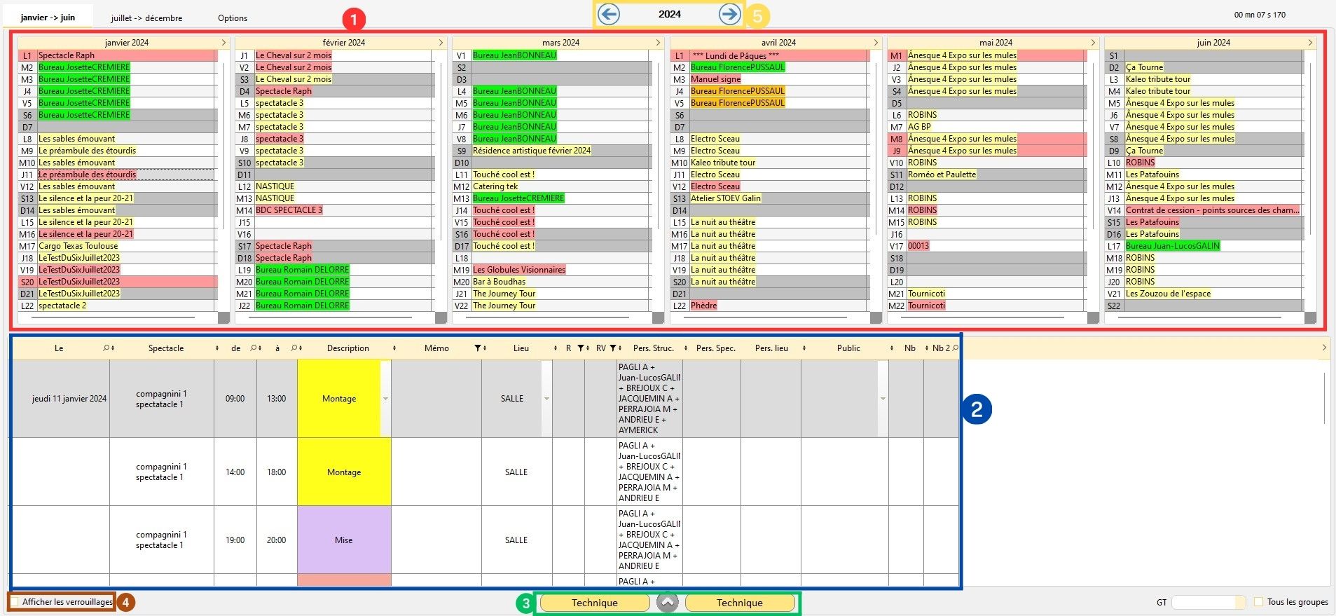 est un outil qui permet l’affichage des activités et des spectacles planifiés sur l’année. Il permet aussi la création et la modification de lignes de planning dans la même logique que le planning graphique des lieux. Il offre une vision globale et synthétique, et permet aussi d’accéder aux calendriers mensuels et quotidiens.