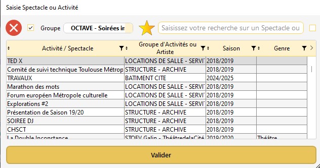 en sélectionnant la fiche artiste ou le groupe d'activité de la fiche spectacle ou activité de la ligne sélectionnée précédemment.