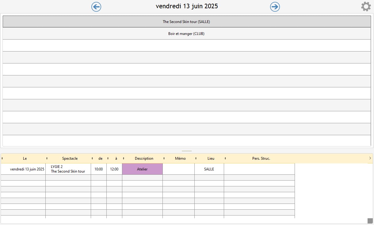 Pour afficher le détail quotidien, cliquez sur le titre d'un spectacle ou le nom d'une activité dans le calendrier quotidien. La table du bas affiche alors le détail quotidien du spectacle ou de l'activité. Pour modifier une ligne de planning, double-cliquez sur cette ligne.