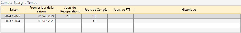 Les jours non posés par la personne sont alors automatiquement enregistrés dans la table "Compte Épargne-Temps" de la fiche de la personne (voir le chapitre "Fiche personnel - Informations 2/2").