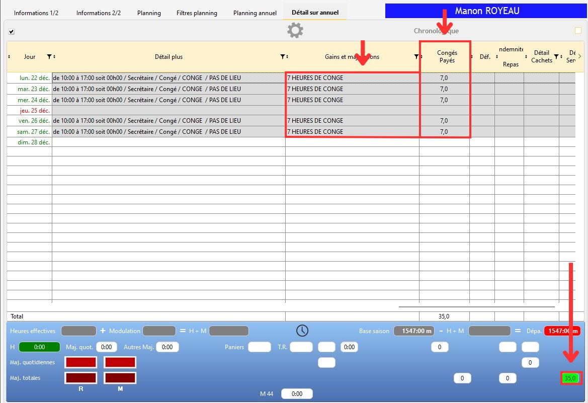 Les lignes de planning assignées à une personne sont réunies et lisibles depuis le Planning annuel de sa fiche personnel (voir le chapitre "Planning Annuel"). Par la suite, les gains et les majorations s'appliqueront automatiquement selon le planning de la personne, conformément à la configuration du personnel qu'on lui aura donnée. Le détail apparaît dans le détail de son planning annuel (voir le chapitre "Détails Planning Annuel").