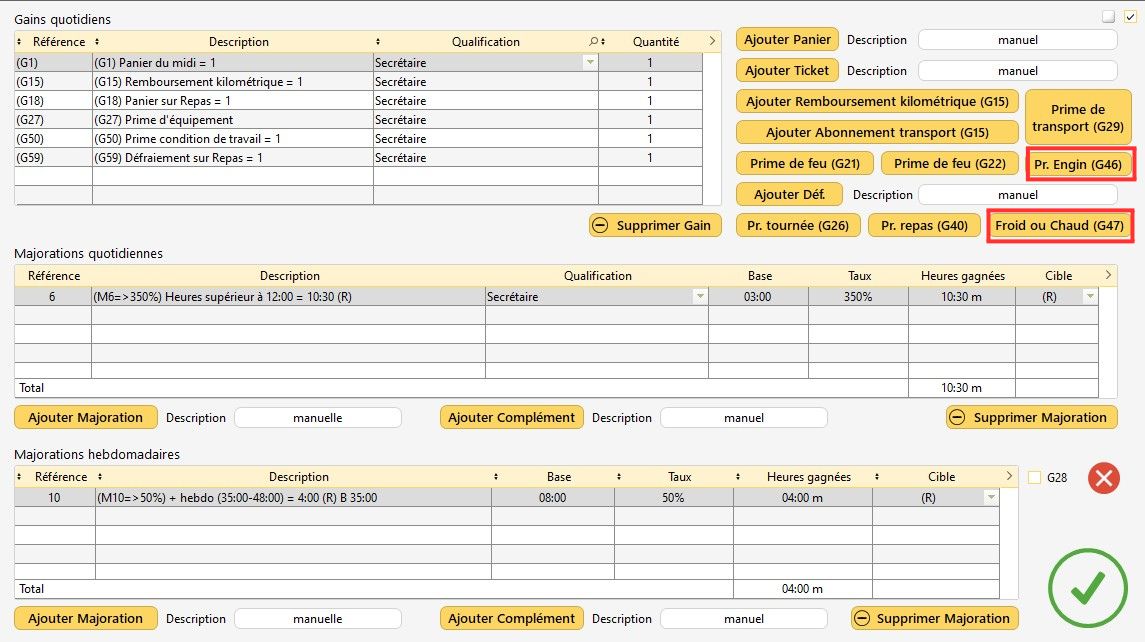 Info : si la coche est rouge, le gain ou la majoration est actif.