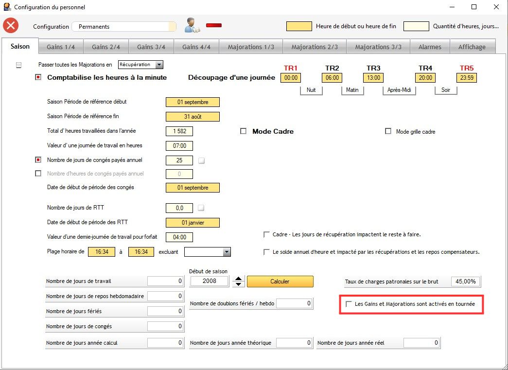 Dans l'onglet "Saison" de la Configuration du Personnel, vous pouvez définir qu'une plage horaire s'étalant sur 2 jours, ne donnera qu'un forfait journalier au lieu de compter un forfait et demi.