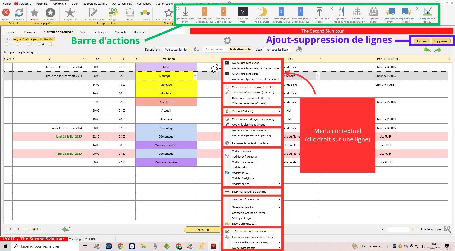 Il existe plusieurs façons de créer des lignes de planning dans l'éditeur de planning d'une fiche spectacle/activité. Il y a par exemple :