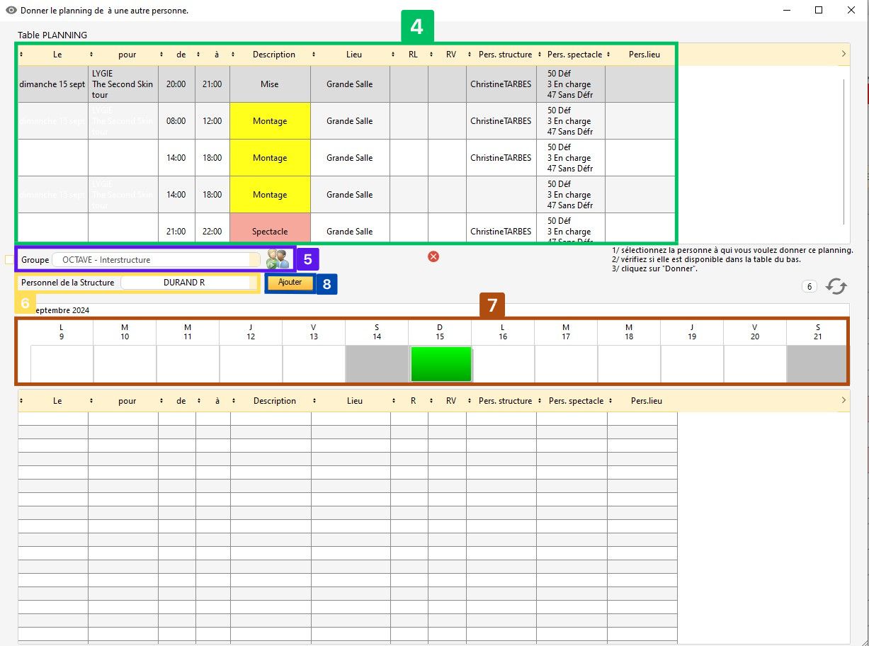 pour affecter le personnel sélectionné en "6" aux lignes de planning renseignées en "4".