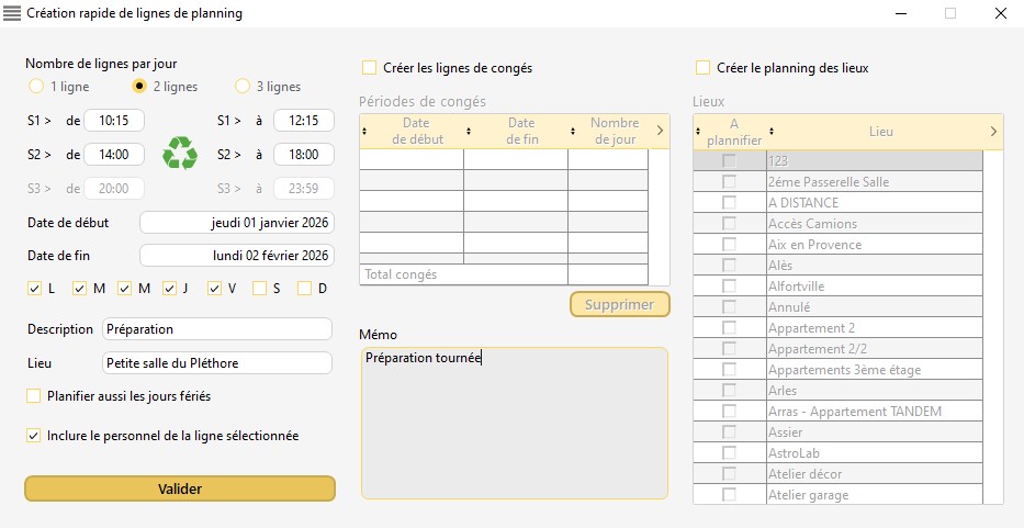 Info : lors de la création automatique de lignes de planning, RS teste la disponibilité des lieux. Un message vous avertira s'il se passe déjà quelque chose le même jour dans le lieu de création. Les informations renseignées dans le Mémo s’intégreront dans la colonne ''Mémo'' de l'éditeur de planning.