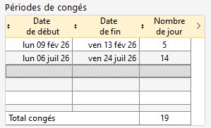 Il est possible de créer des horaires de bureau et du planning du congés depuis cette fenêtre. Toutefois il est recommandé de passer par le Planning Annuel de la personne depuis la "Création rapide des heures de bureau".