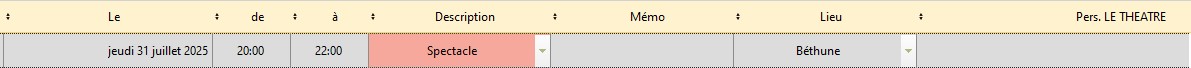 Info : l'heure de fin du spectacle est automatiquement calculée par rapport à la durée du spectacle. Une fois cette ligne enregistrée (clic sur une autre ligne), le calcul automatique n'est plus actif et vous pouvez modifier cette heure de fin.