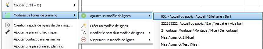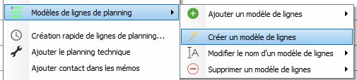 2/ Faites un clic droit pour sélectionner votre modèle de lignes de planning. Survolez "Modèles de lignes de planning", puis "Ajouter un modèle de lignes", et sélectionnez enfin votre modèle.