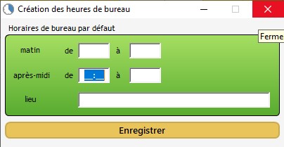 1/ Créez votre semaine-type, sur la période et le lieu choisis, dans la fenêtre "Création des Heures de bureau" (Rappel : à partir du "Planning annuel" d'une personne).