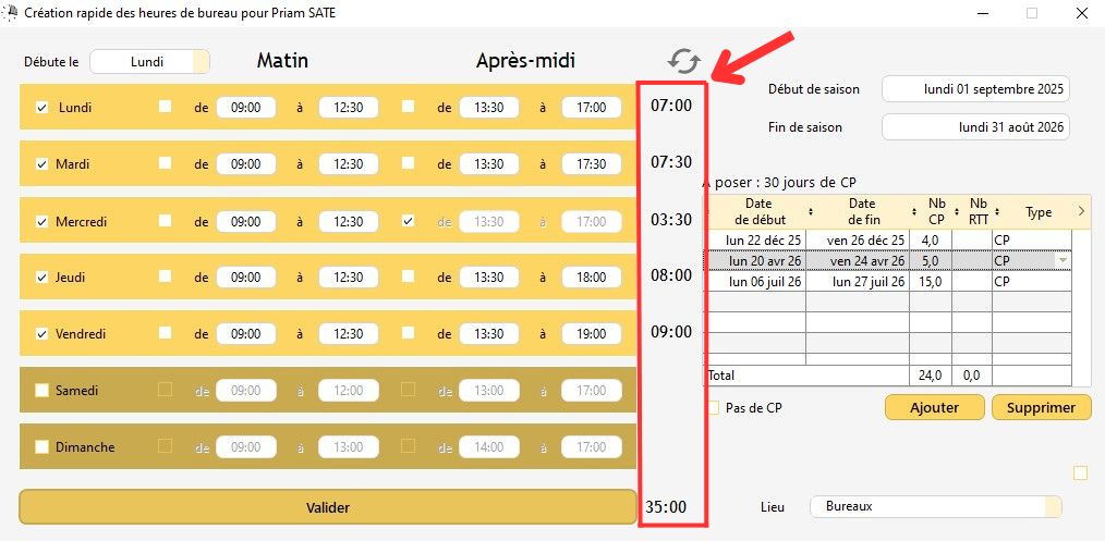 Pour améliorer la planification, des compteurs d'heures sont visibles à droite des tranches horaires.