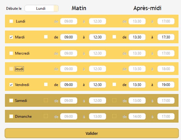 Pour désactiver un jour, décochez la case devant le jour de la semaine. Les tranches horaires de ce jour se grisent (voir lundi dans la capture ci-dessous).