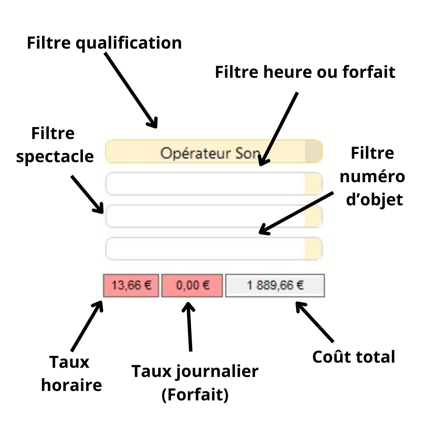 1/ sélectionnez votre filtre (qualification - forfait/heure - spectacle).